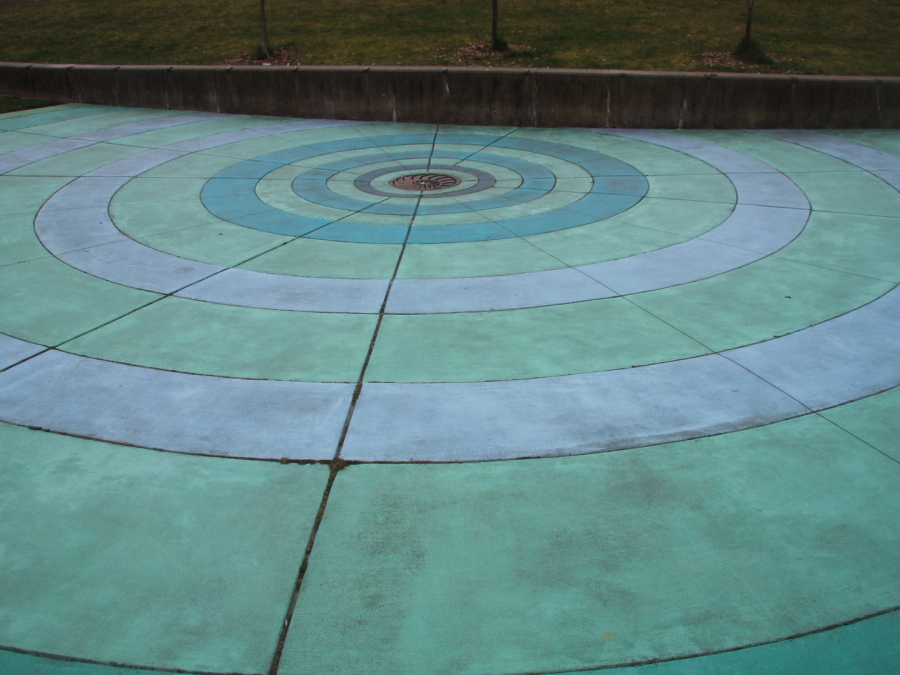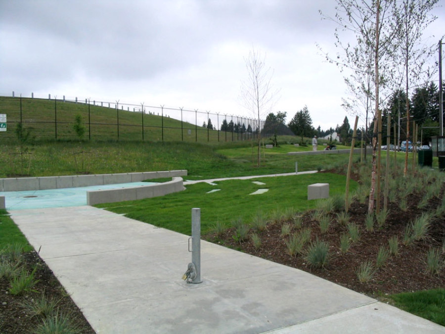 - Development of plaza (including a colored concrete patter, paths and seating walls, instillation of trash receptacle, and a bike rack