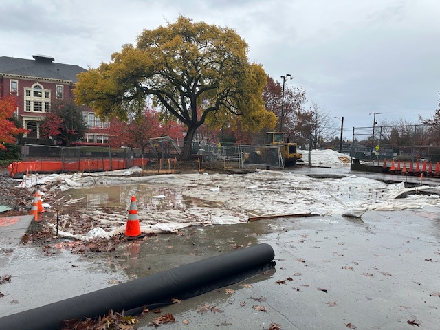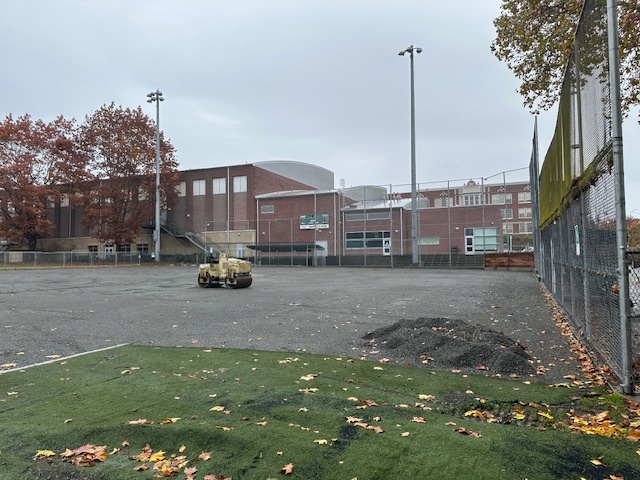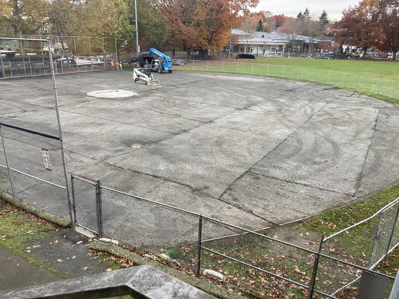 tennis and basketball, nature play area and climate adaptive garden. Scope also includes removal, protection, and reinstallation of existing on-site memorial